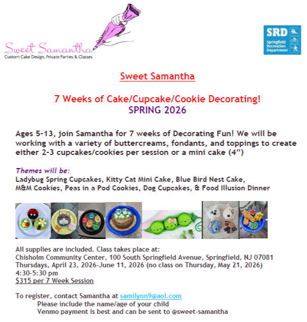 Registration is open for Sweet Samantha cake/cupcake/cookie decorating classes in Spring 2026 at the Chisholm Community Center (100 South Springfield Avenue), in partnership with the Springfield Recreation Department.